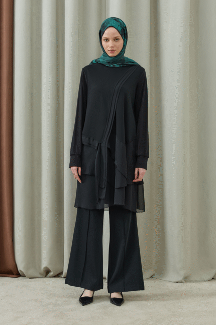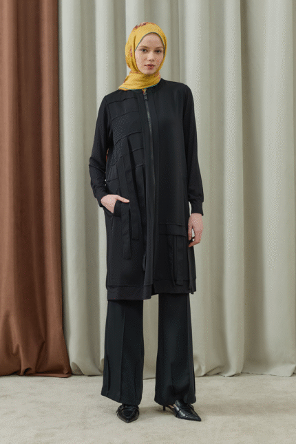 Cep Detaylı Şifon Şeritli Tesettür Tunik