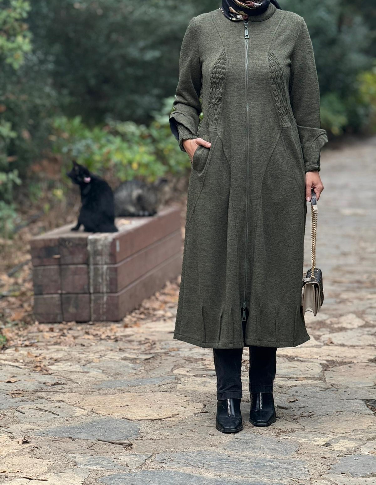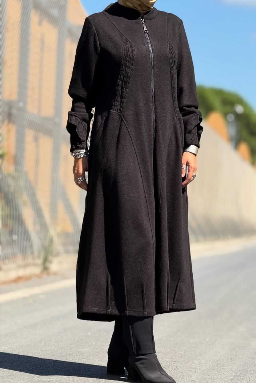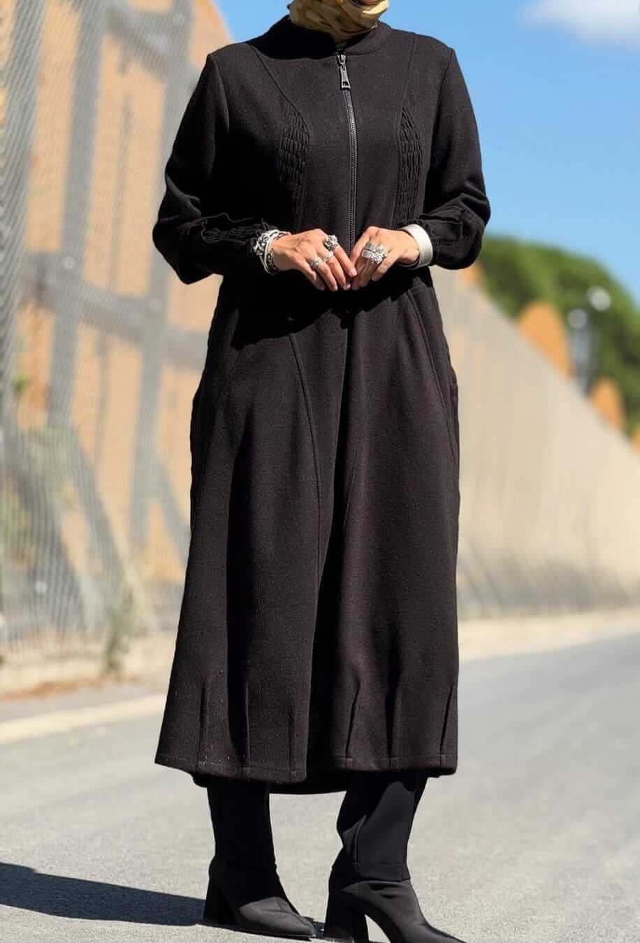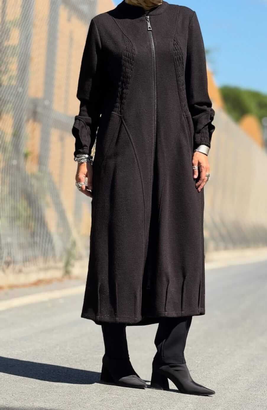 Hakim Yaka Büzgü Detaylı Fermuarlı Pardesü