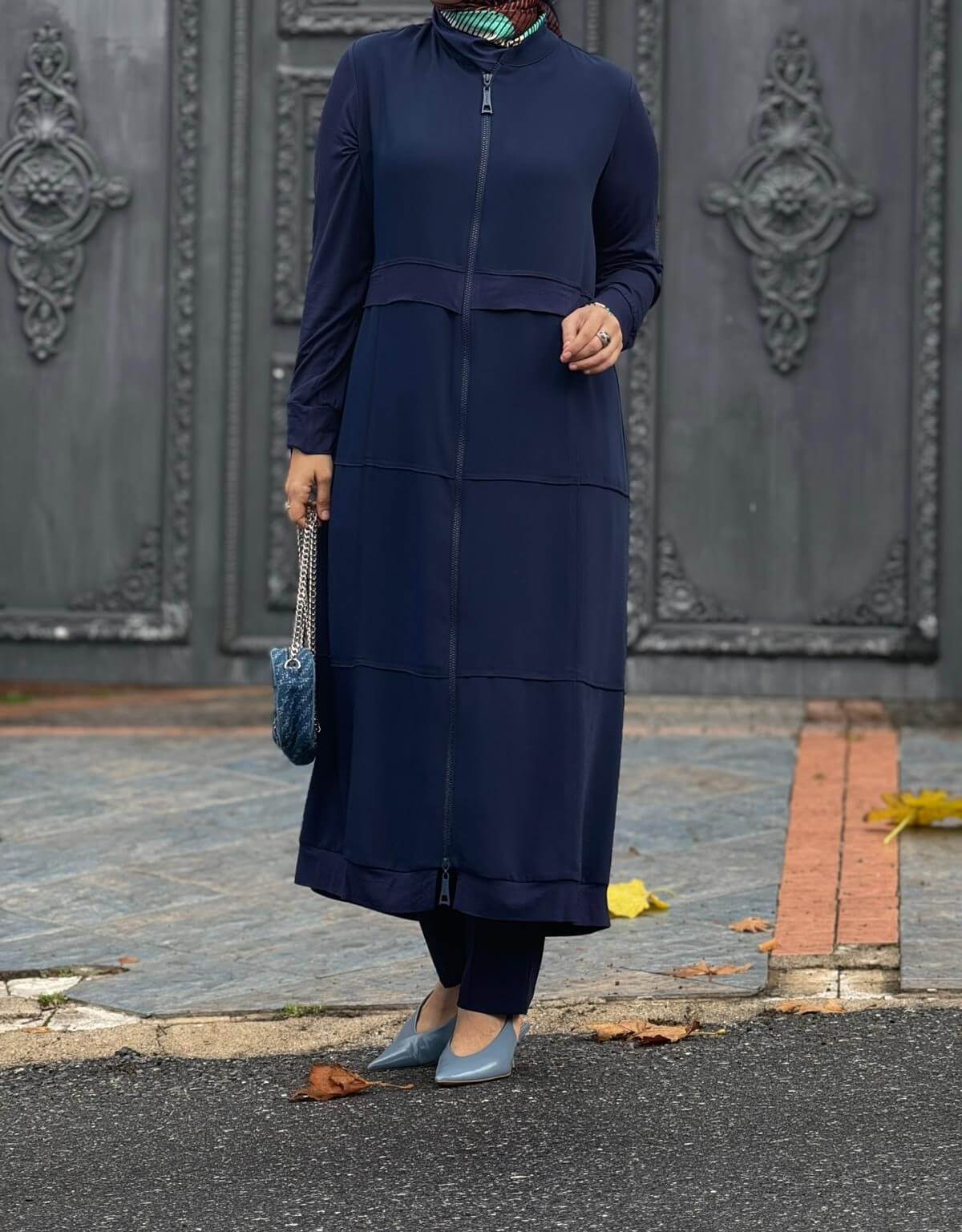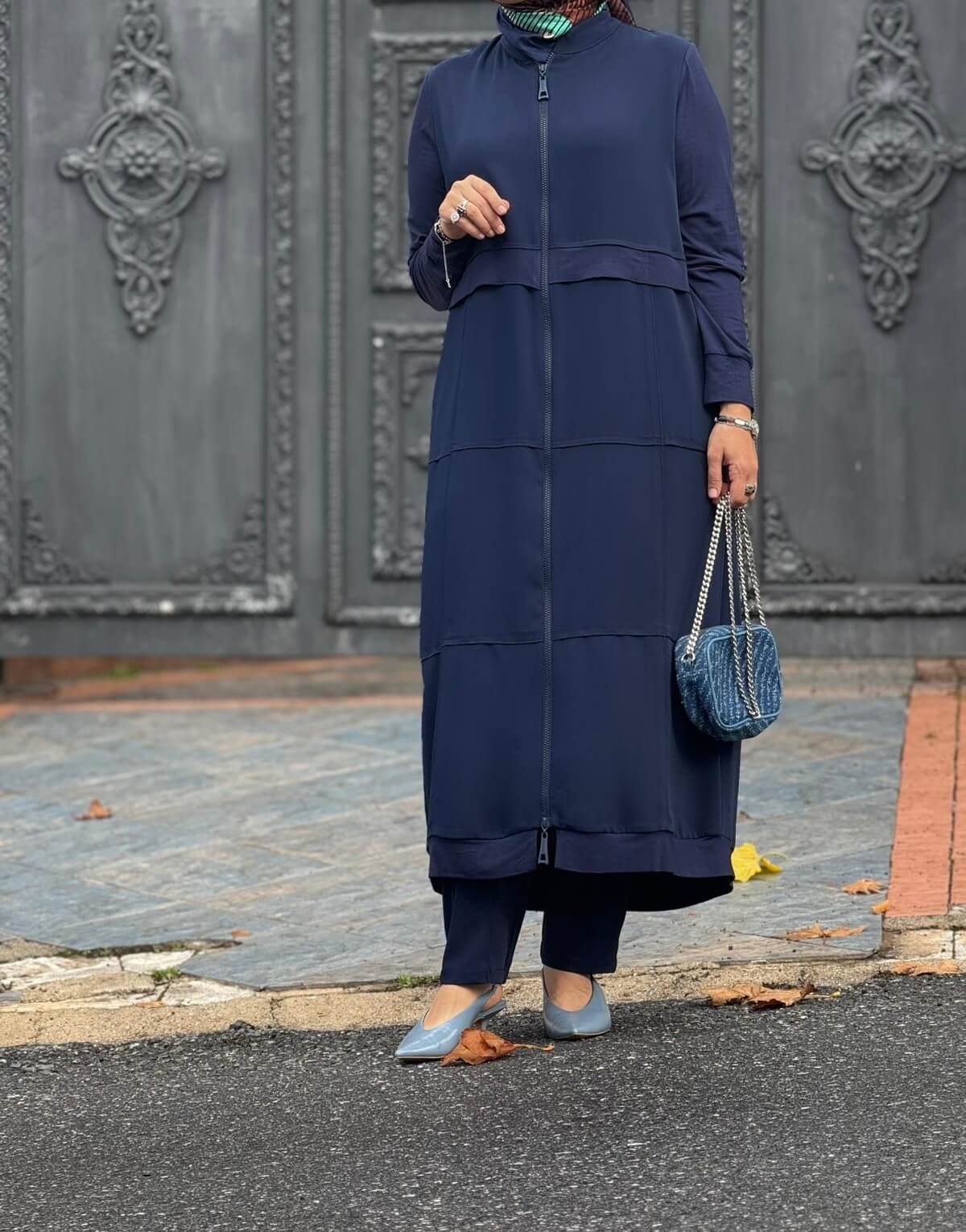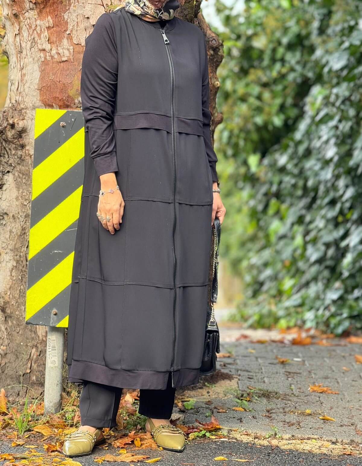 Fermuarlı Asimetrik Dikiş ve Cep Detaylı Ferace