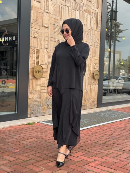 Kat Kat Şifon Detaylı Uzun Krep Elbise